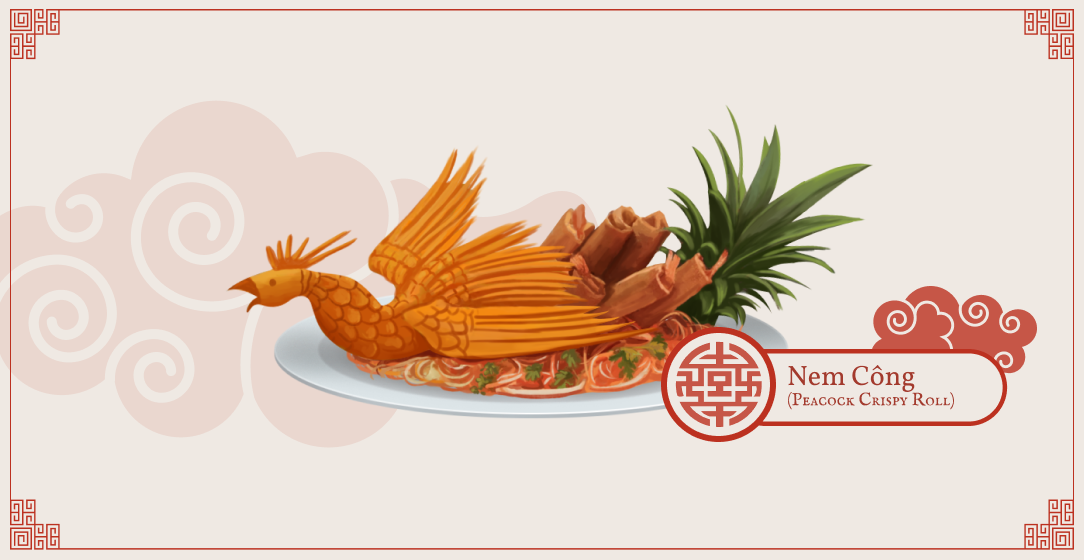 Nem Công, or Peacock Crispy Roll, has its origins in Huế’s royal cuisine during the Nguyễn Dynasty, symbolizing luxury and nobility. Originally made with peacock meat, modern versions use alternative ingredients due to conservation laws. This dish maintains its traditional presentation and is served during festivals, reflecting its cultural significance.